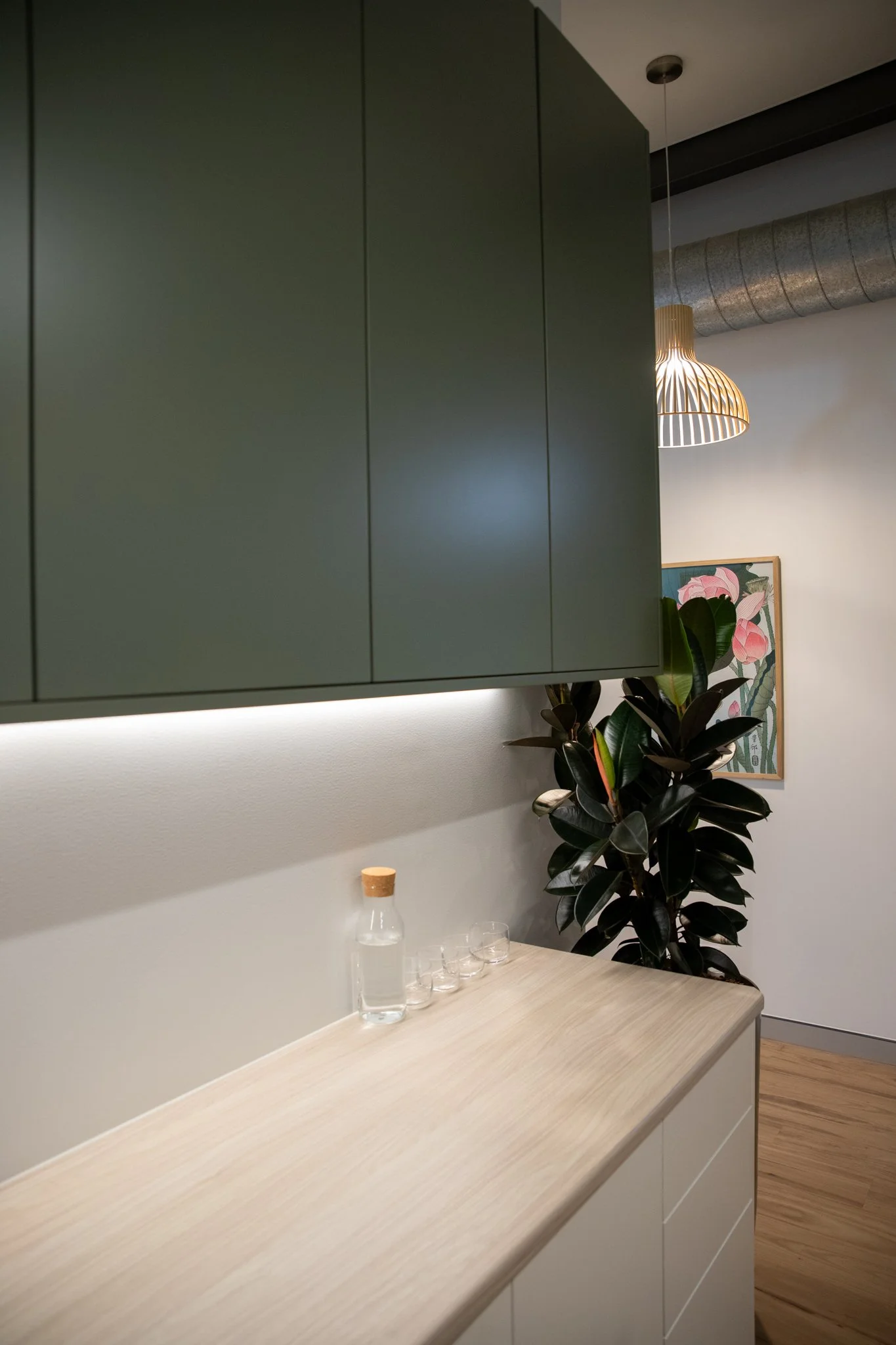 Muted green cabinetry, light timber benchtops, fluted feature detailing, integrated LED lighting