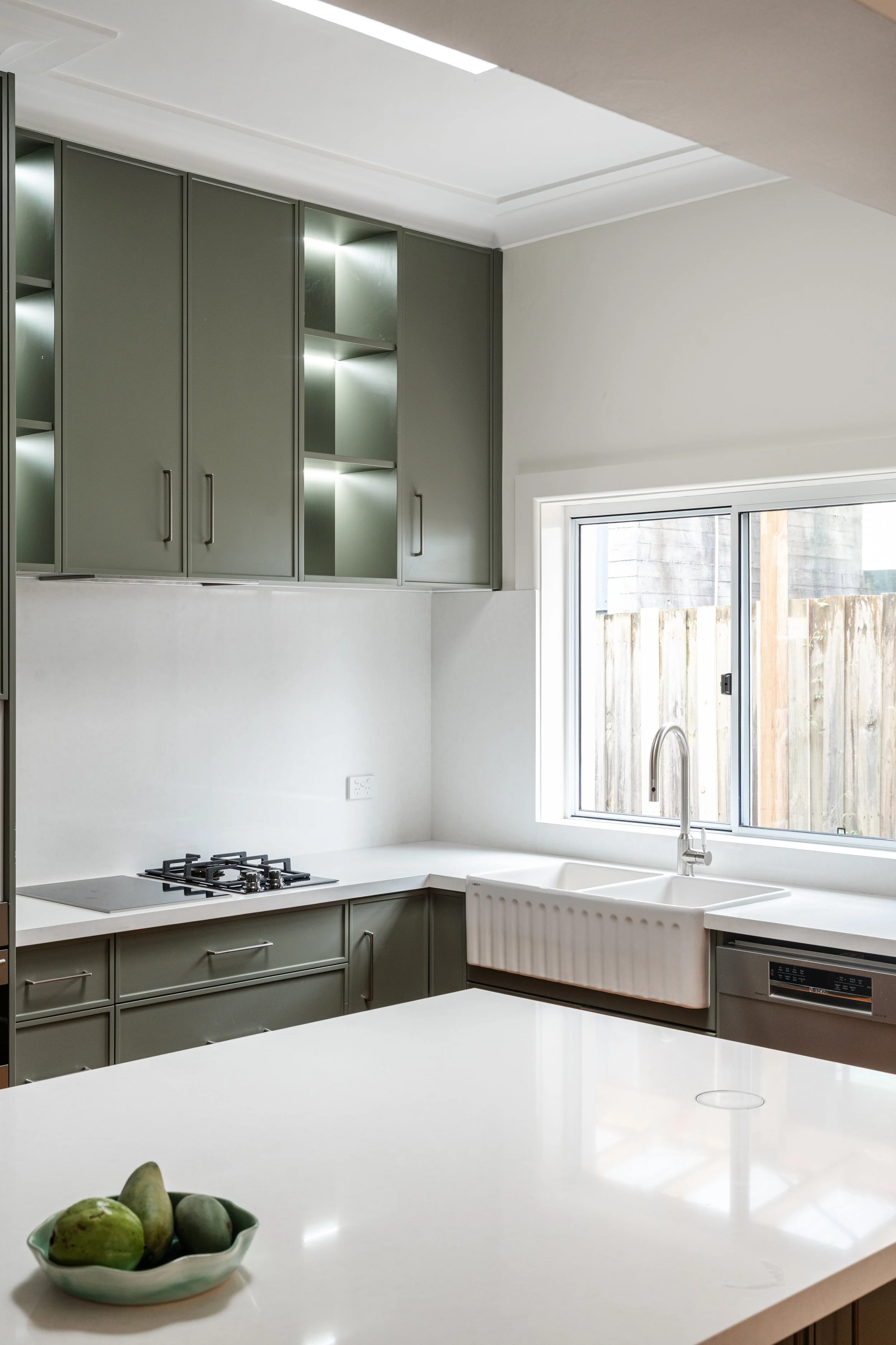 Painted cabinetry in a muted green tone, matte white benchtops, integrated LED lighting